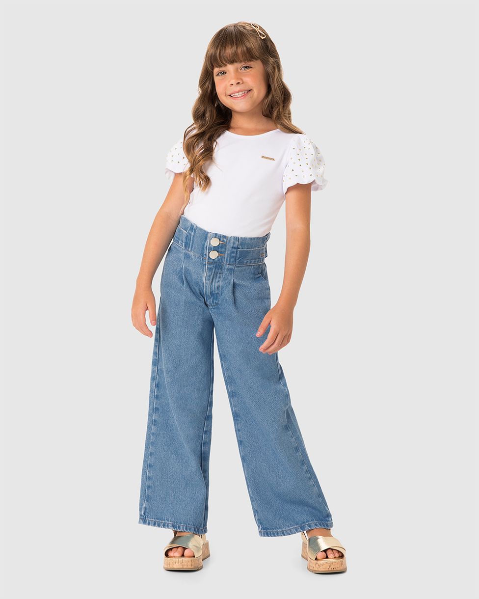 Calça Menina Wide Leg Cintura Ajustável Em Jeans 100% Algodão - Carinhoso