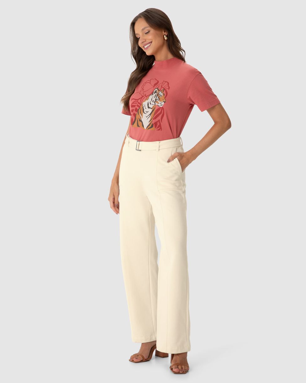 Calça Reta Feminina Com Cinto E Bolso Funcional Em Moletom Flanelado