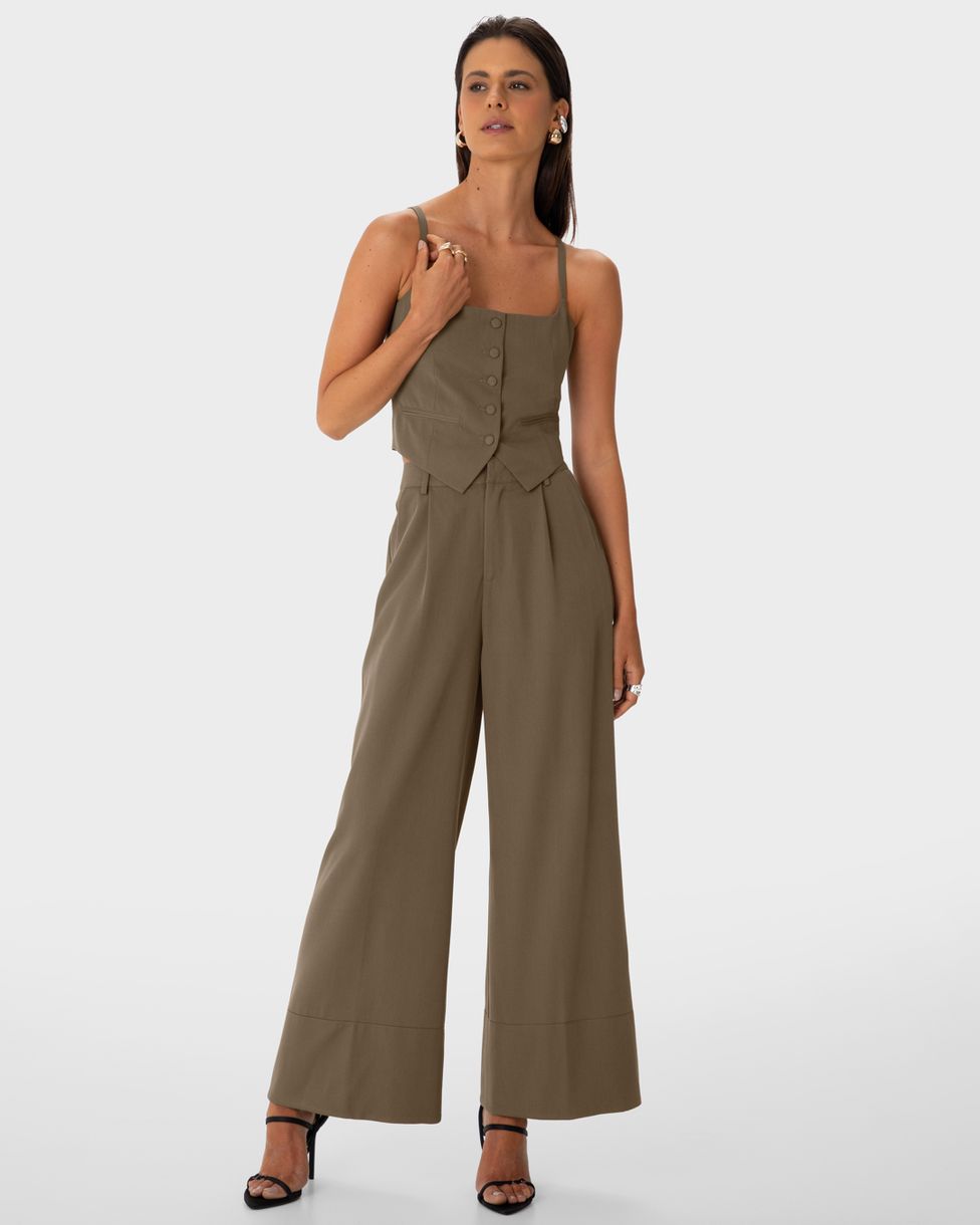 • Calça Wide Leg Cropped em Viscose Sarjada