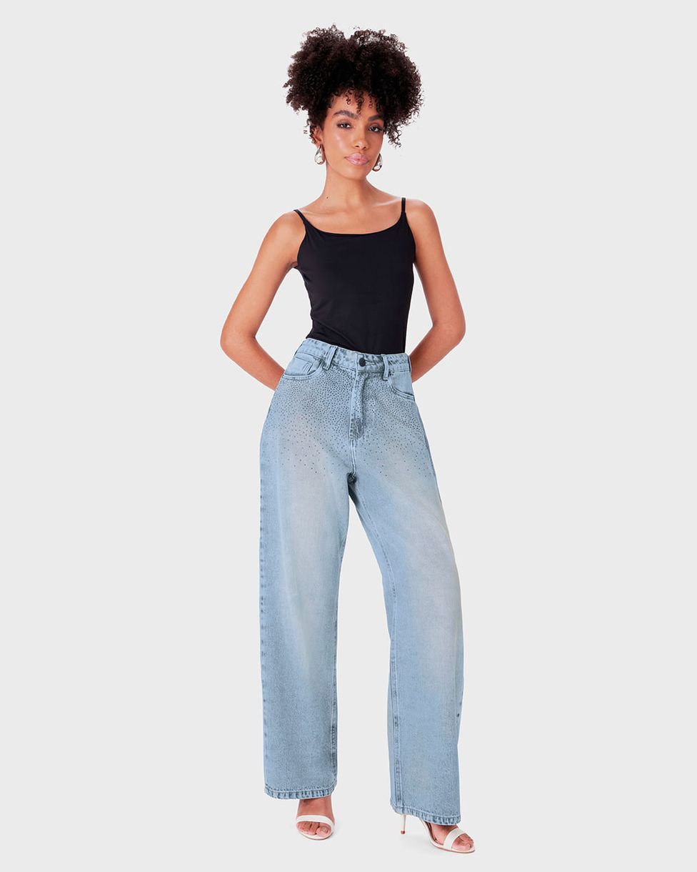 Calça Wide Leg Feminina Aplique Rebite Em Jeans 100% Algodão - ENFIM