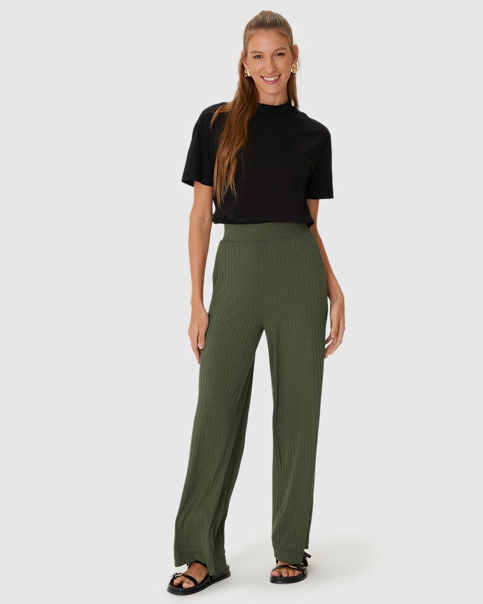 • Calça Wide Leg Em Malha Canelada de Viscose