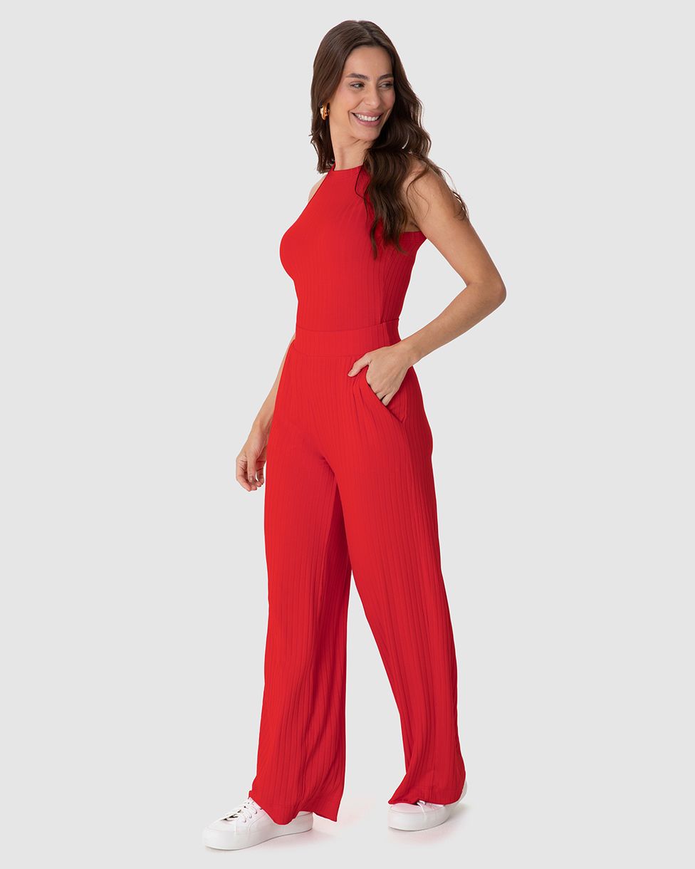 Calça Wide Leg Feminina Cintura Alta Em Malha Canelada De Viscose Vermelho - XGG