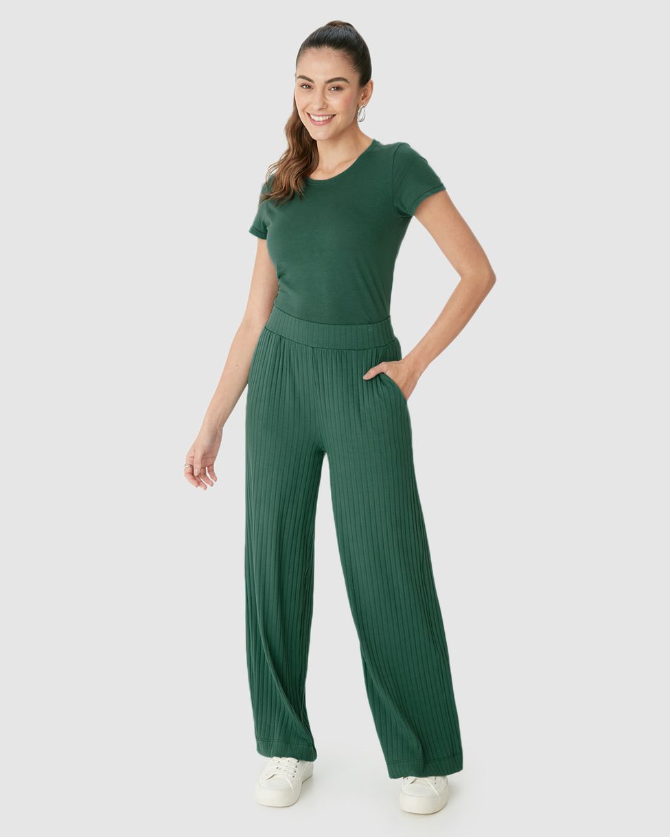 Calça Wide Leg Feminina Cintura Alta Em Malha Canelada De Viscose Verde - G