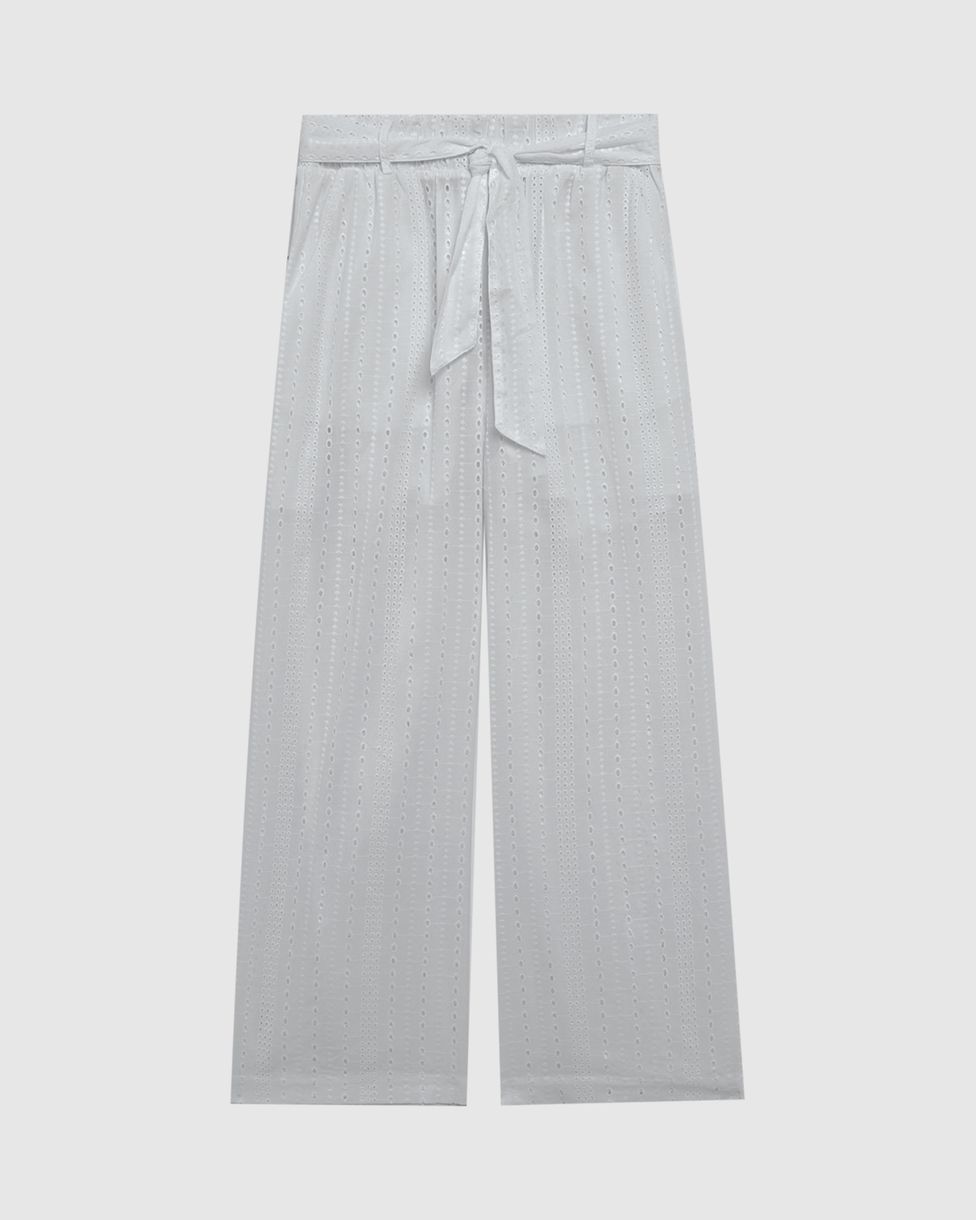 Calça confeccionada em laise. A calça Wide Leg, com pernas mais amplas que descem aumentando levemente até a barra, é uma peça super em alta e moderna para compor os looks da estação, ela conta com passantes no cós, bolsos laterais e detalhe para a faixa na cintura. Além disso, o tecido de laise em algodão exibe um estilo mais romântico e delicado, sendo mais encorpado mas que apresenta textura de desenhos com bordados vazados. Para um visual monocromático, combine com blusa do mesmo tom e tecido e tênis baixo!