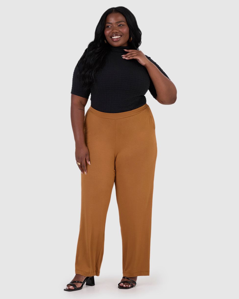 Calça Wide Leg Feminina Plus Size Bolso Faca Em Moletinho De Viscose