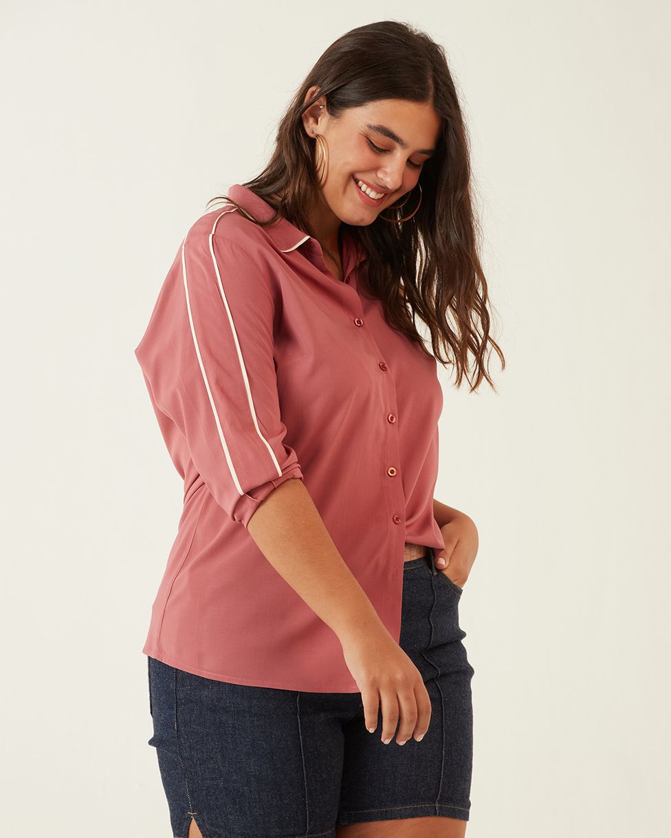 Camisa confeccionada em viscose com elastano. Modelo possui mangas longas, gola esporte e fechamento frontal por botões. Detalhe de viés em tom constraste. Plaqueta metálica posterior. Uma peça cheia de estilo e ideal para combinar com jaqueta de pu, calça jeans skinny e tênis flatform.
