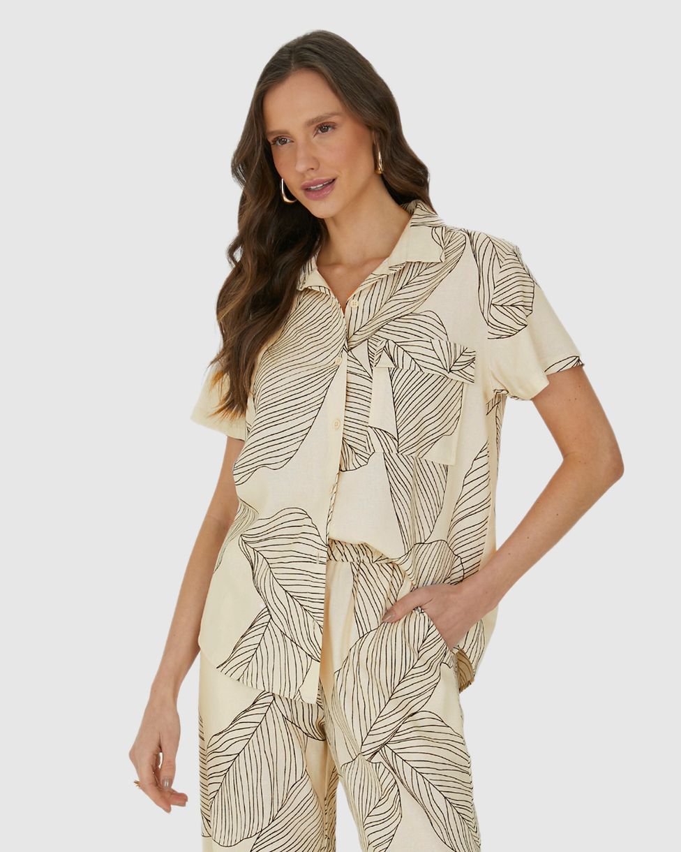 Camisa Feminina Folhagem Com Bolso Funcional Em Viscolinho