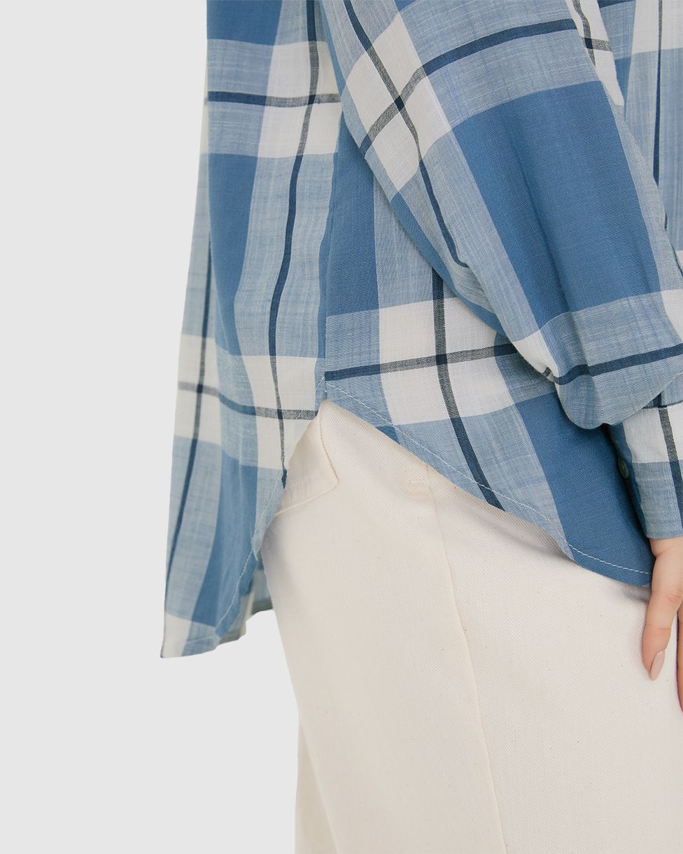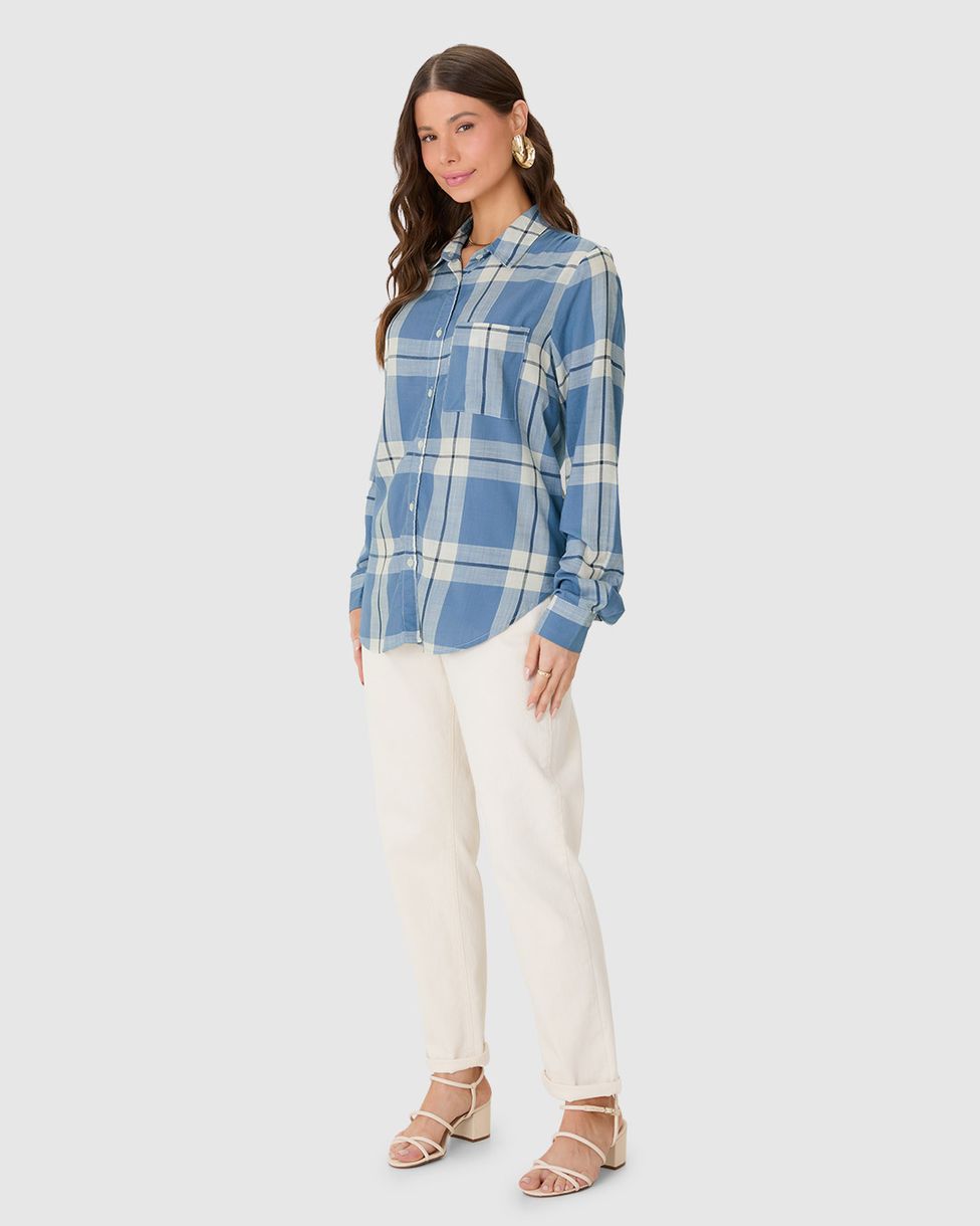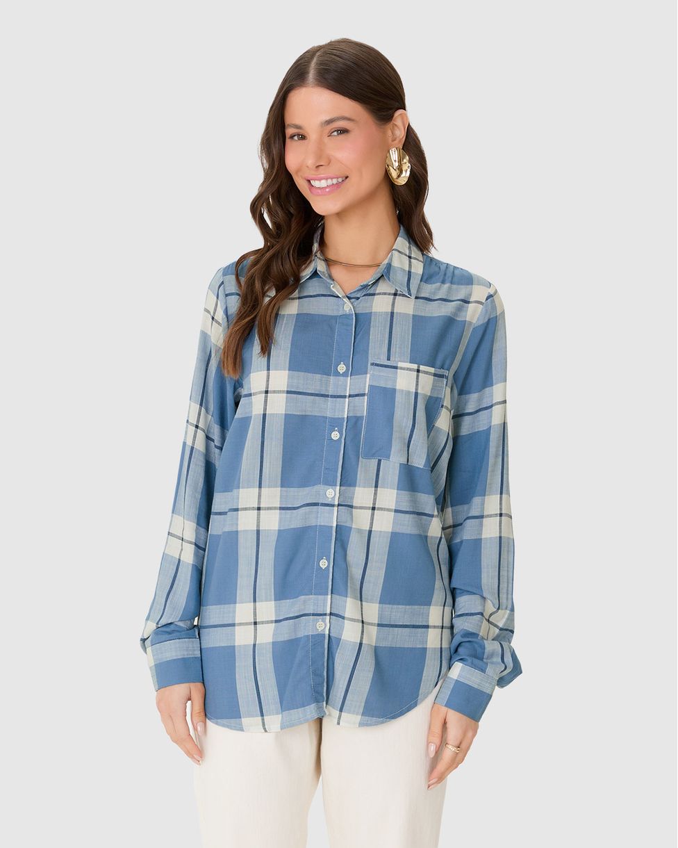 Camisa Feminina Manga Longa Xadrez Em Viscose Sarjada Azul - M