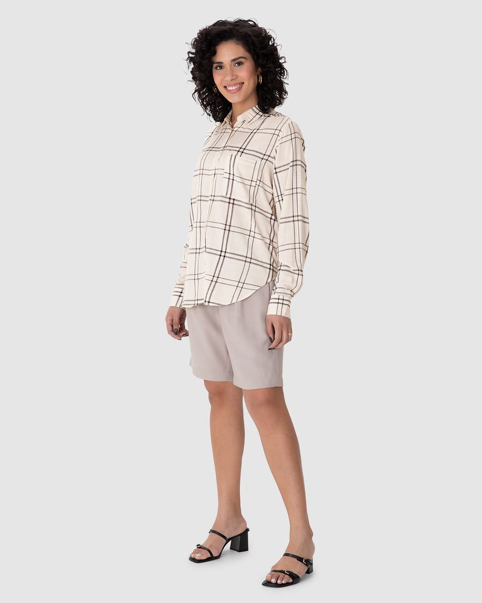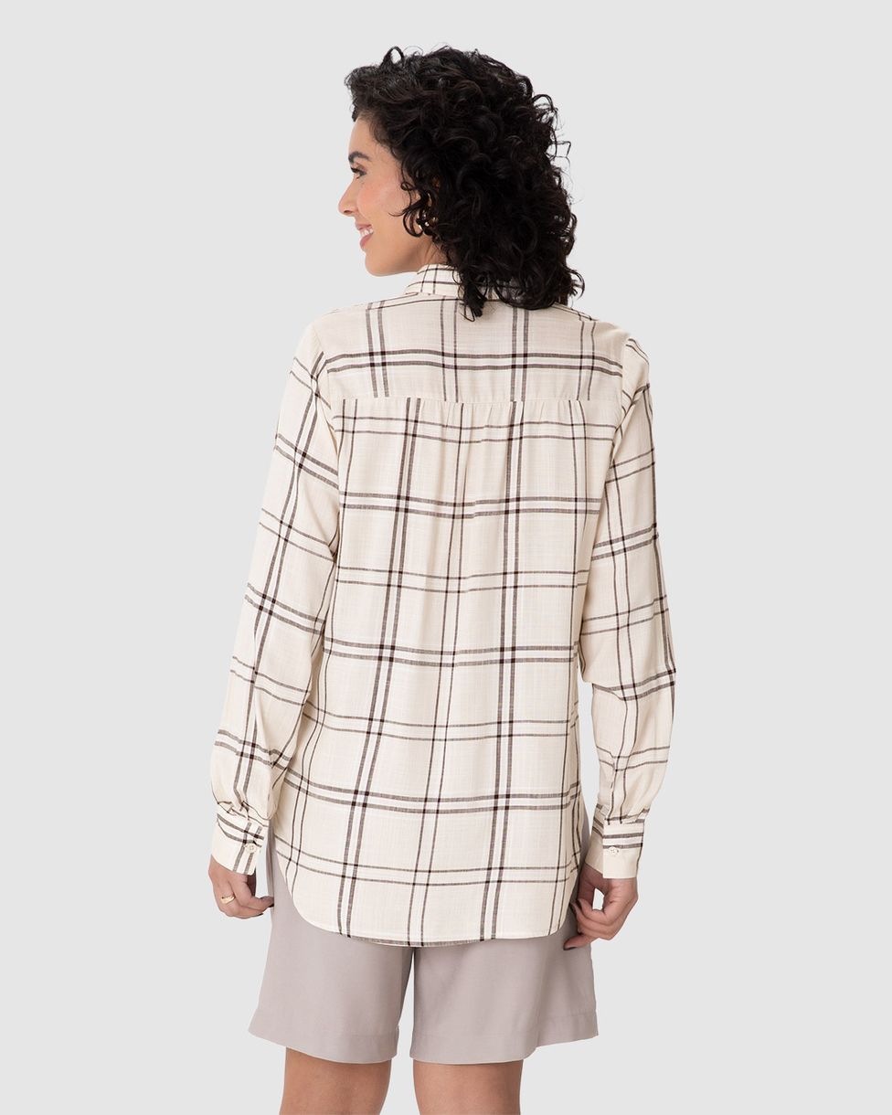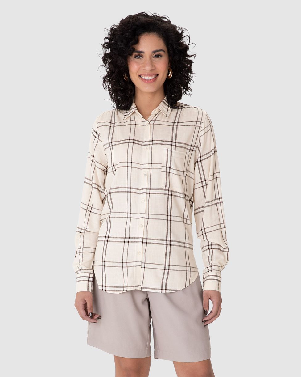 Camisa Feminina Manga Longa Xadrez Em Viscose Sarjada Off White - P