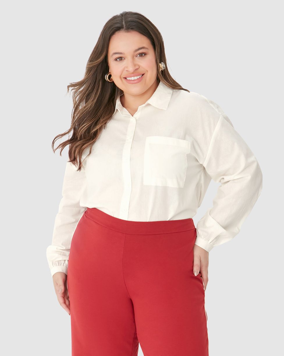 Camisa Feminina Plus Size Bolso Frontal Em Tricoline Off White - G3