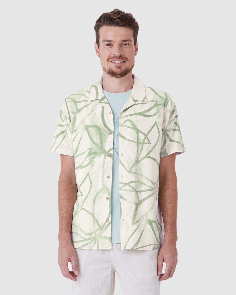Camisa Masculina Estampa Folhagem Manga Curta Em Algodão