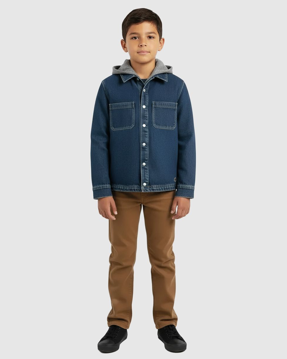 A Camisa Menino Manga Longa Com Capuz Em Jeans Leve - Carinhoso é moderna e versátil, perfeita para compor looks casuais e cheios de estilo. Confortável e despojada, combina o charme do jeans leve com a praticidade de um design que encanta os garotos.