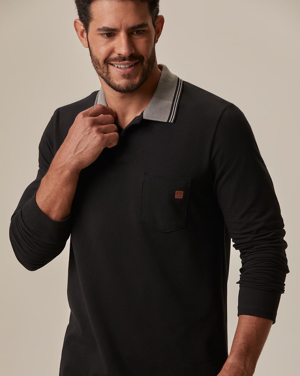 Camisa Polo Básica Masculina Bolso Frontal Manga Longa Em Piquet Premium Preto - P