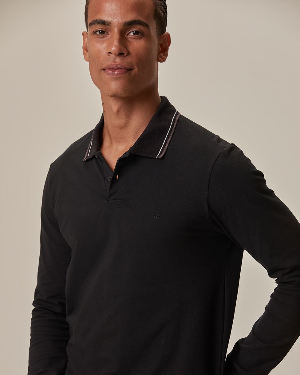 Camisa Polo Básica Masculina Gola Retilínea Manga Longa Em Piquet Stretch