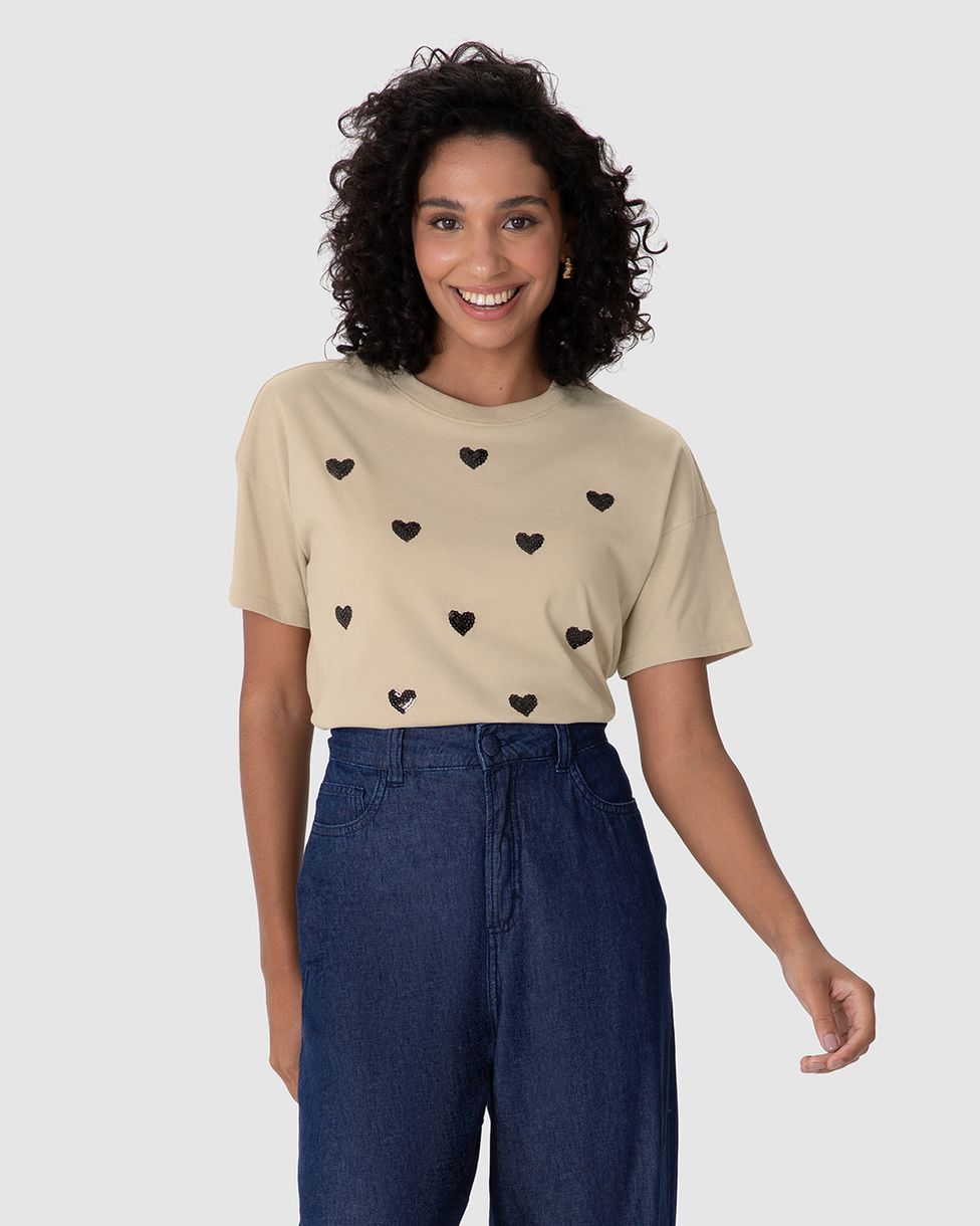 Camiseta Ampla Feminina Bordado Lantejoula Corações Em Algodão Marrom - PP