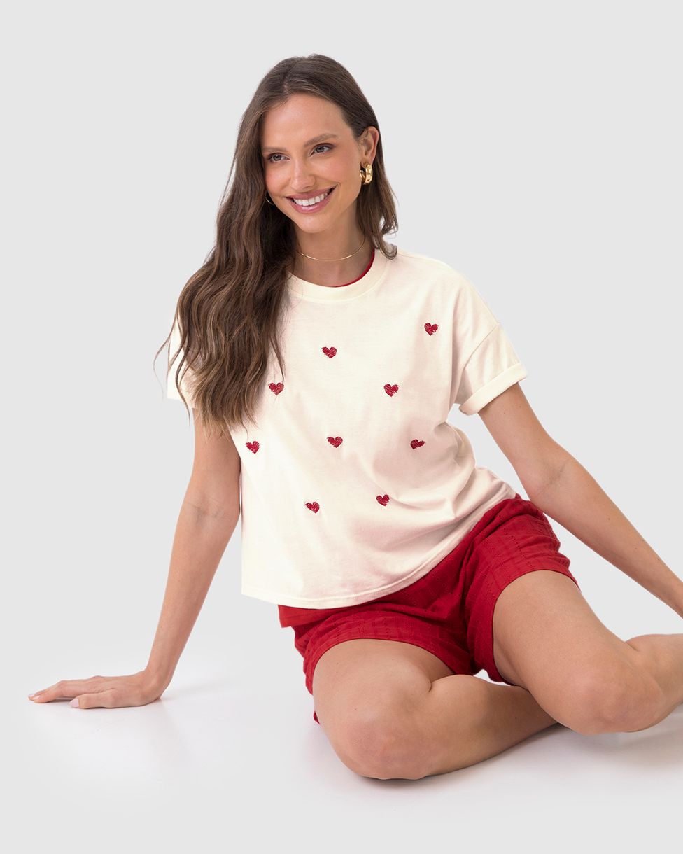 Camiseta Ampla Feminina com Bordados Frontais Delicados Em Algodão