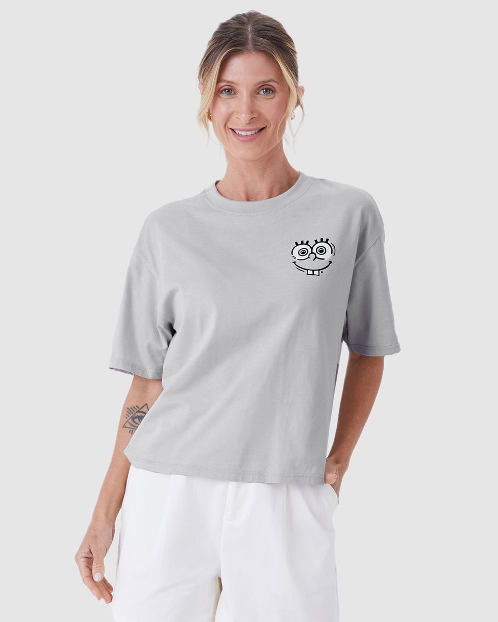 Camiseta Feminina Box Bob Esponja Em Algodão Cinza - G