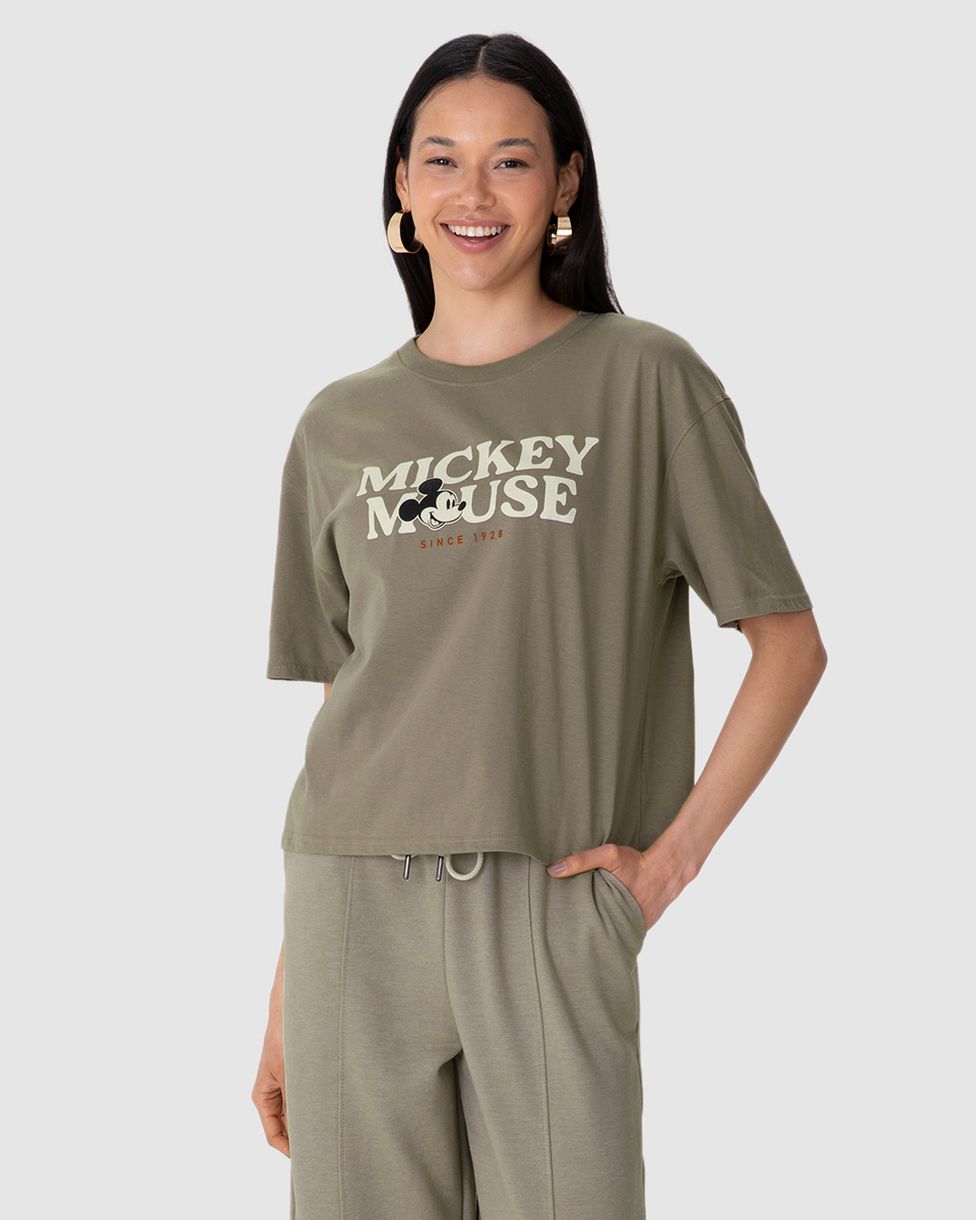 Camiseta Feminina Box Estampa Especial Mickey Mouse Em Algodão Marrom - PP