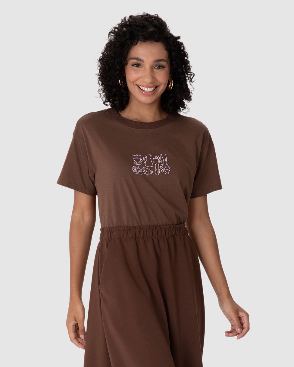 Camiseta Feminina Estampa Happiness Frente E Costas Em Algodão Marrom - PP
