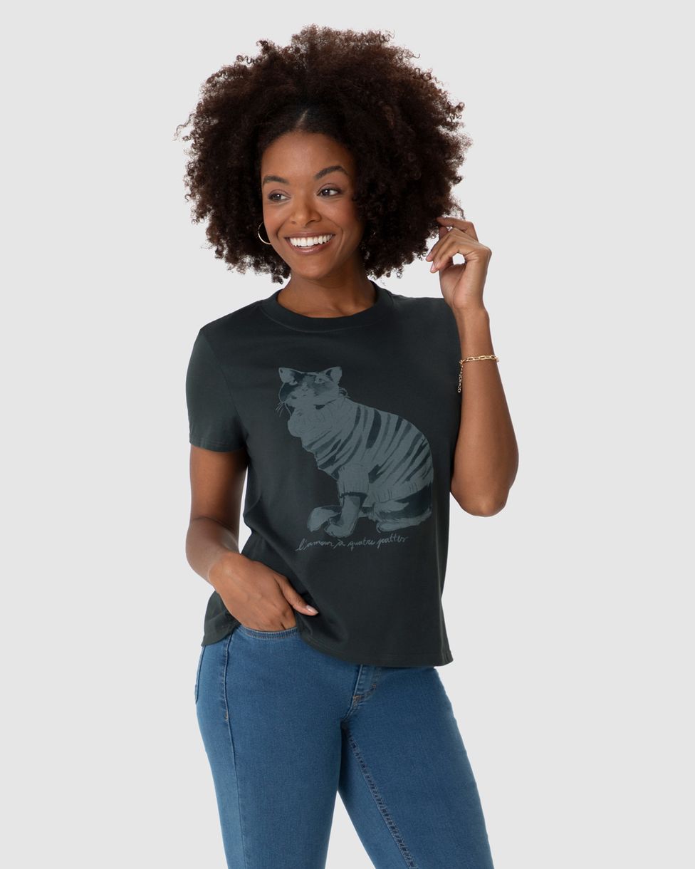Camiseta Feminina Manga Curta Estampa Frontal Ilustrativa Em Algodão