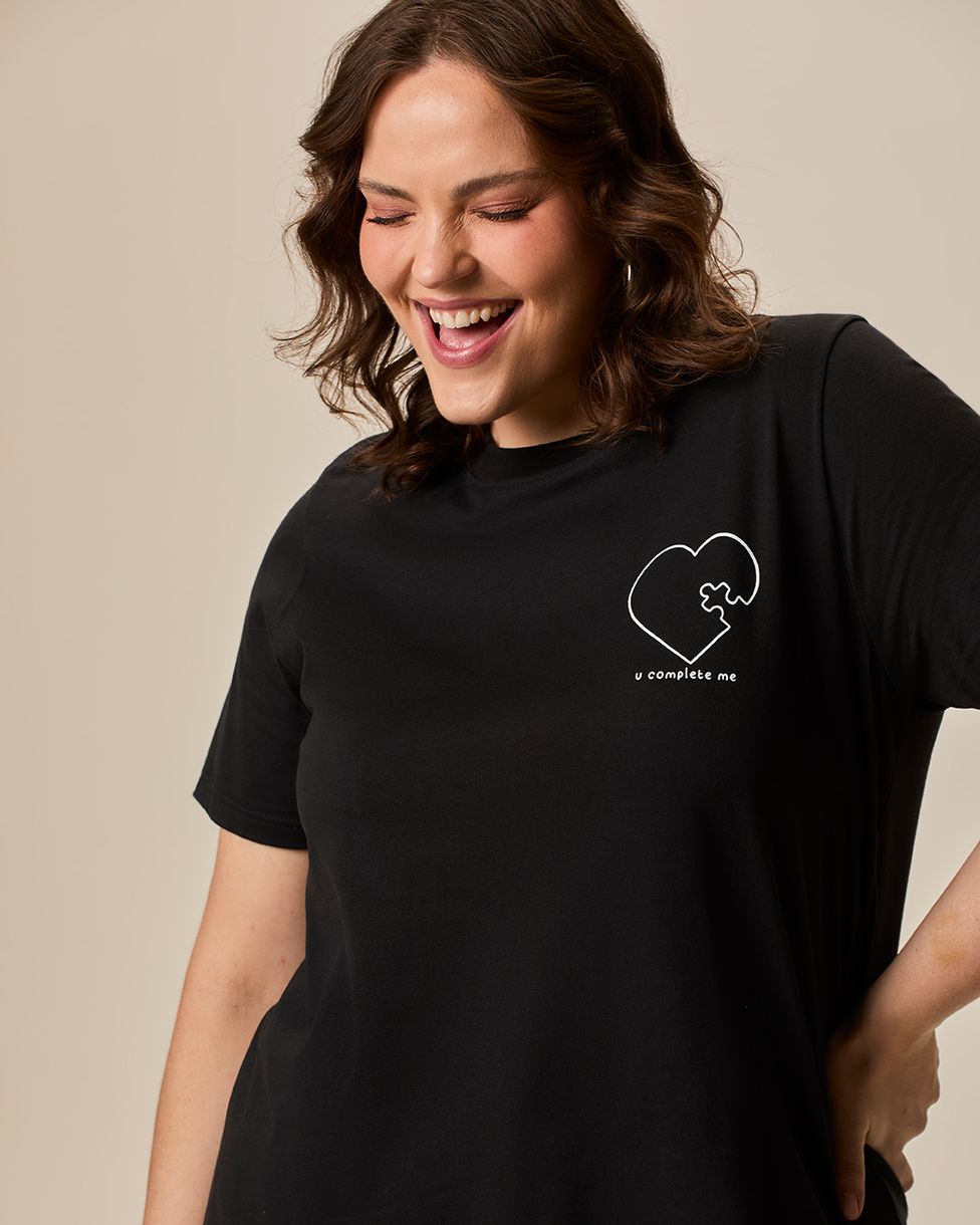 Camiseta Feminina Plus Size Ampla U Complete Me Em Algodão Preto - G4