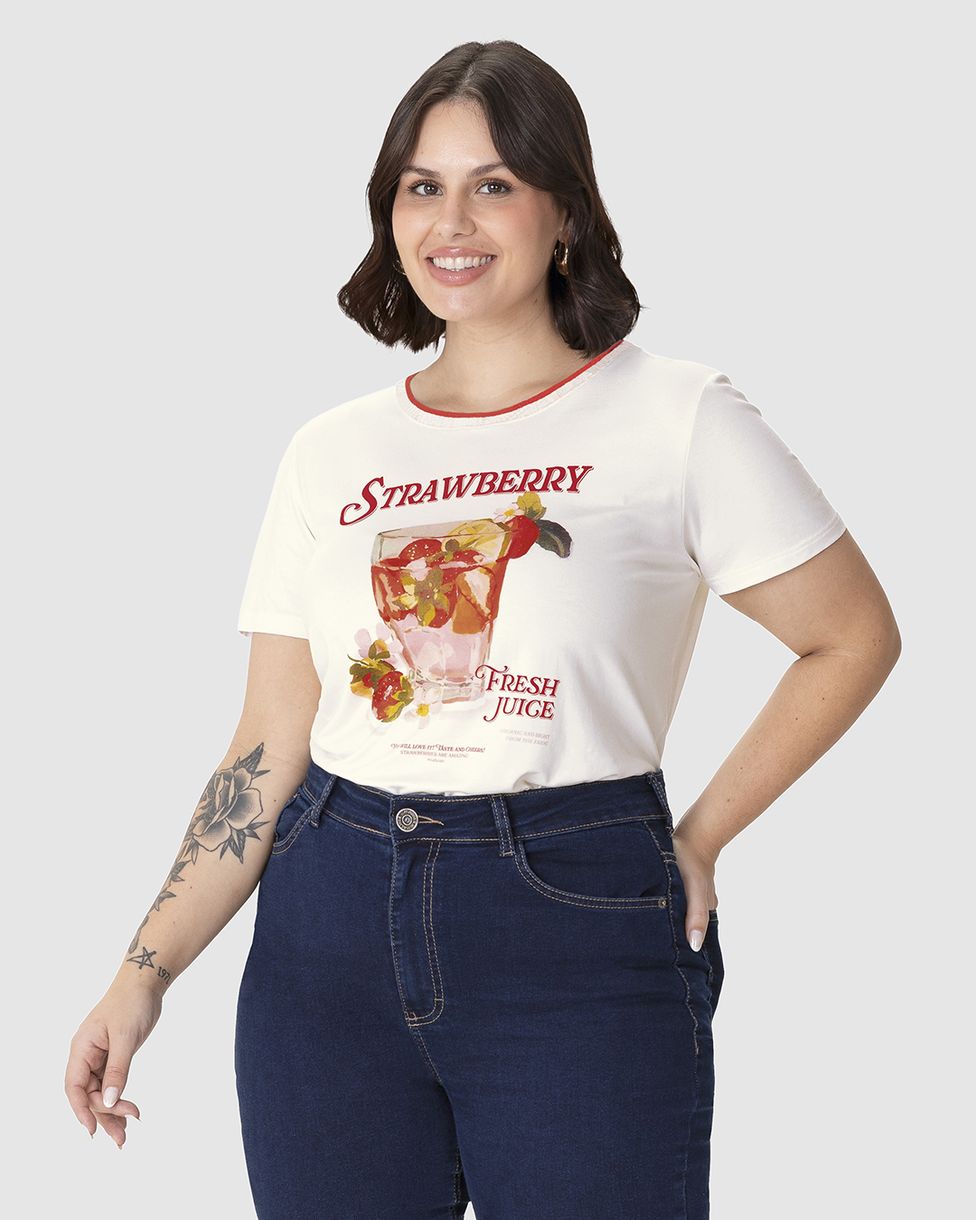 Camiseta Feminina Plus Size Strawberry Fresh Juice Em Viscose Stretch Off White - G4