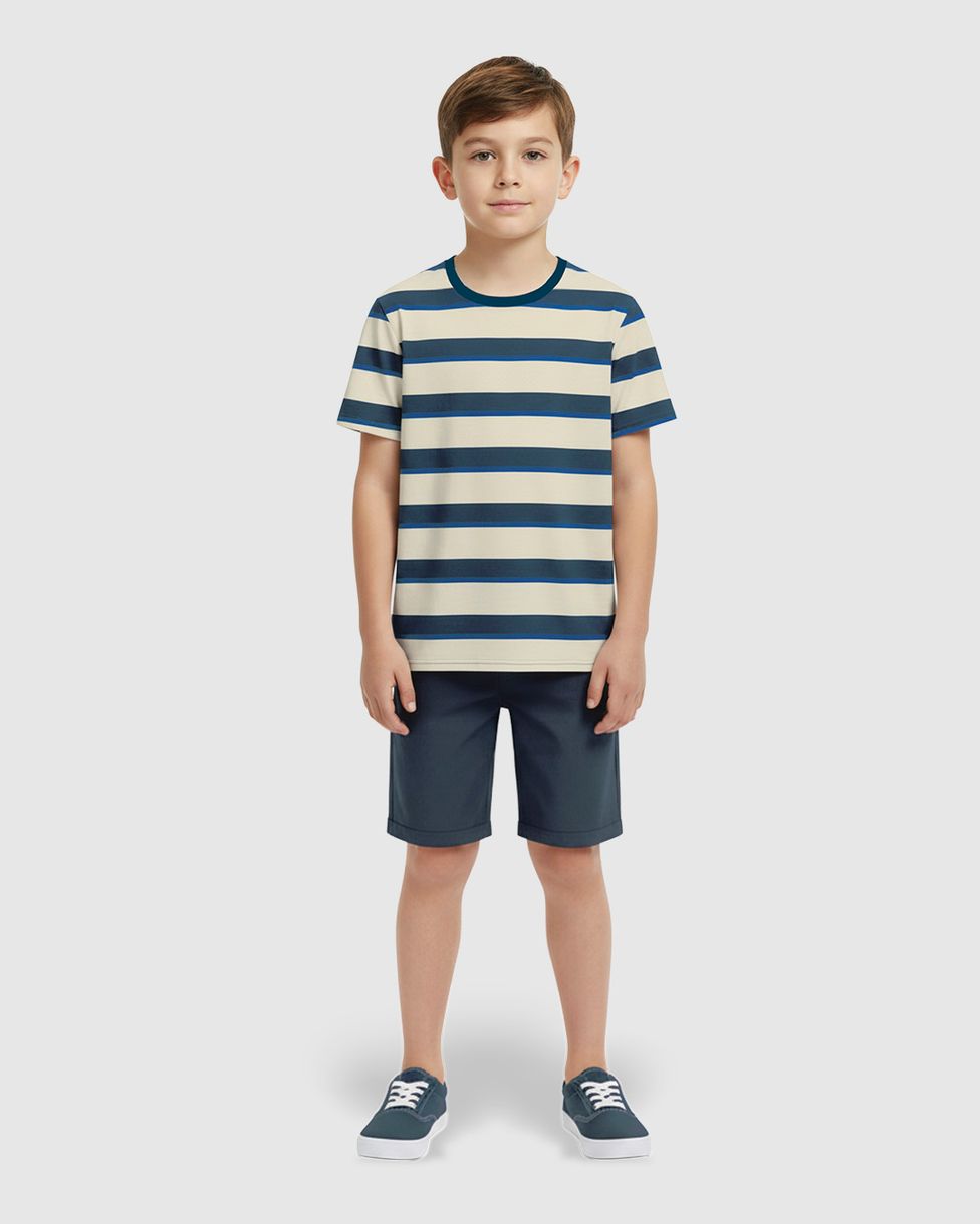Camiseta infantil confeccionada em meia malha de algodão. Com caimento tradicional, que acompanha as linhas do corpo com muito conforto, essa camiseta possui decote redondo, mangas curtas e estampa corrida listrada. Além disso, a meia malha em algodão tem bom caimento e durabilidade, que proporciona leveza e frescor ao vestir. Uma peça versátil e cheia de conforto para o dia a dia do seu menino.