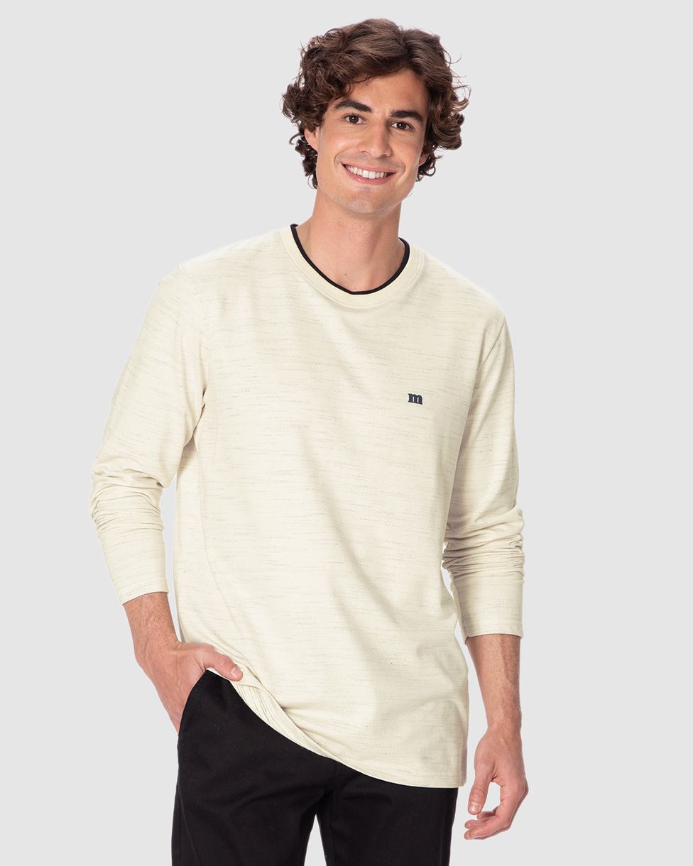 Camiseta Masculina Manga Longa Estampa Discreta Peitoral Em Moletinho Rajado