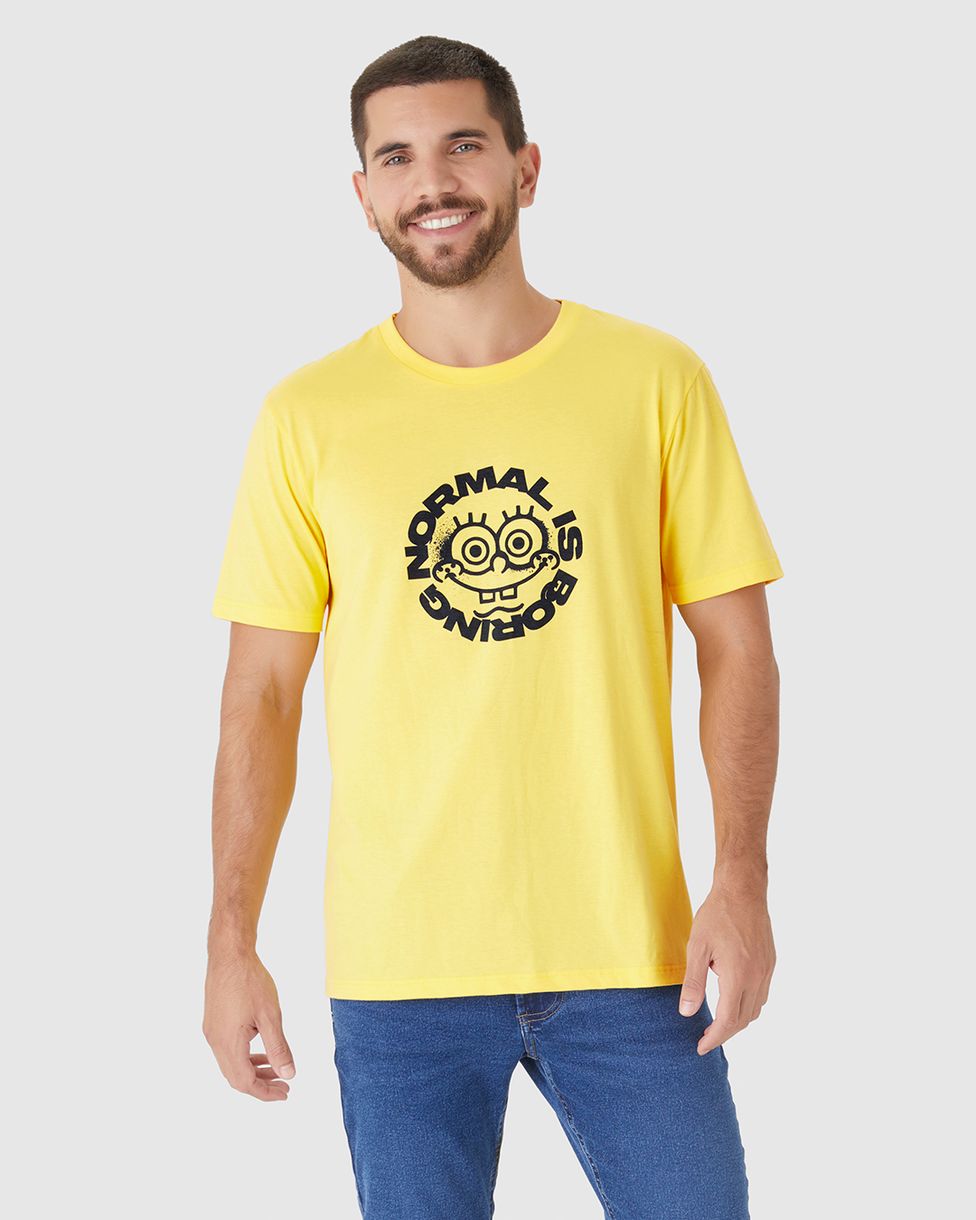 Camiseta Masculina Normal Is Boring Bob Esponja Em Algodão: Para quem gosta de sair do comum, essa camiseta une conforto e estilo. Feita em algodão macio, ela garante leveza e frescor. Com uma estampa divertida “Normal Is Boring” do Bob Esponja®, é ideal para looks descontraídos e cheios de personalidade.