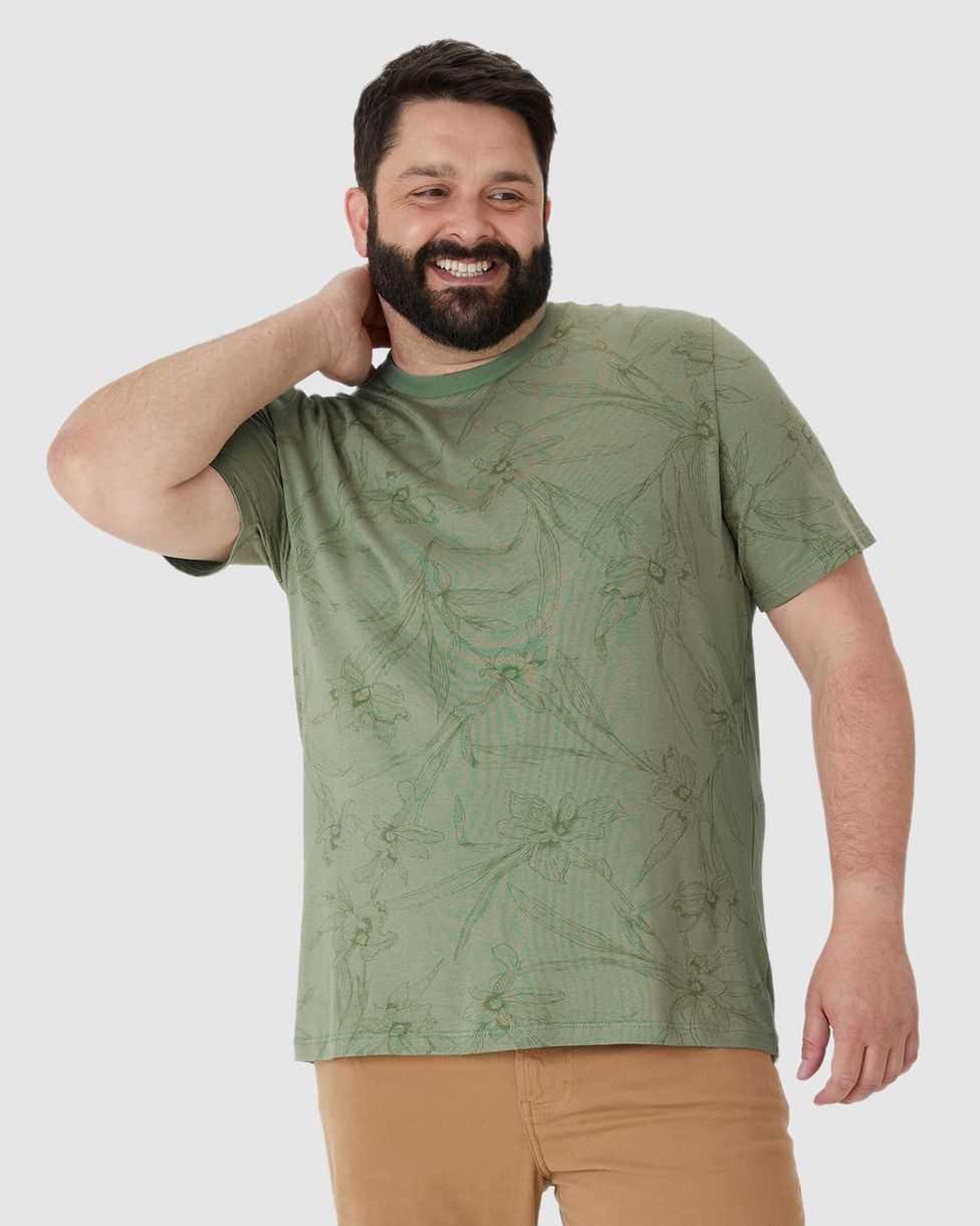 Plus SizeMasculinoCamisetasCamiseta Masculina Plus Size Estampa Floral Em Malha Linho