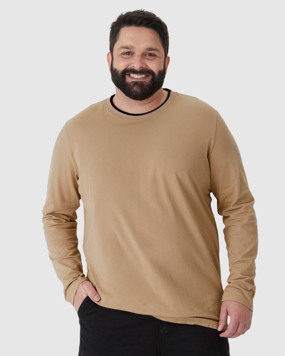 Camiseta Masculina Plus Size Gola Redonda Manga Longa Em Piquet Stretch