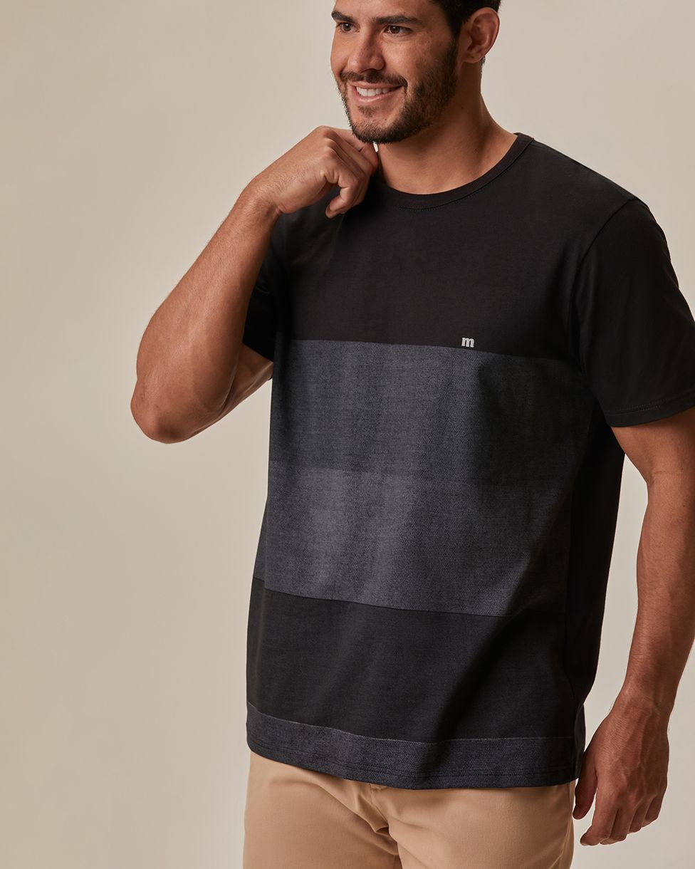 Camiseta Masculina Regular Estampa Listras Frontais Em Algodão Preto - XGG