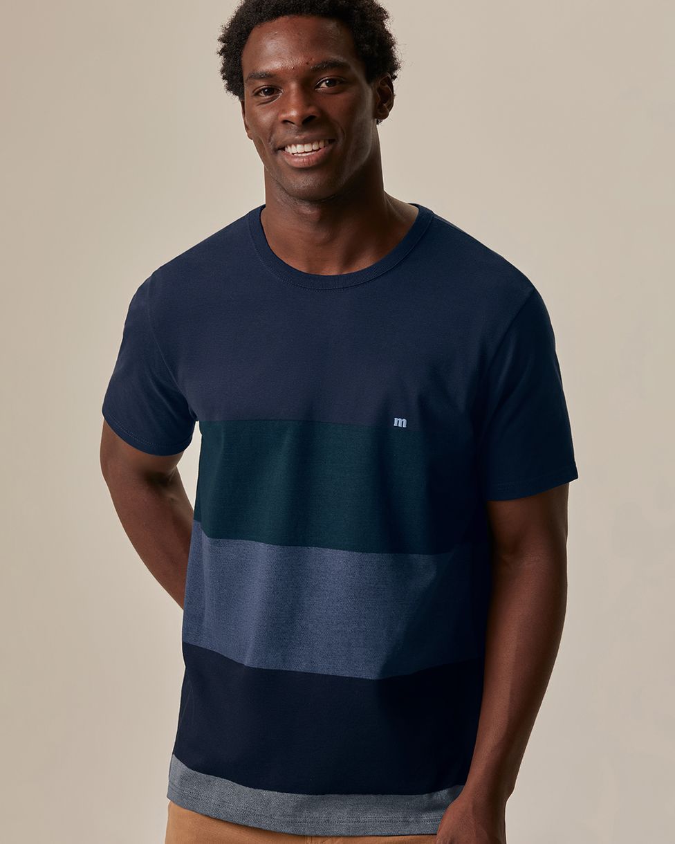 Camiseta Masculina Regular Estampa Listras Frontais Em Algodão Azul - G