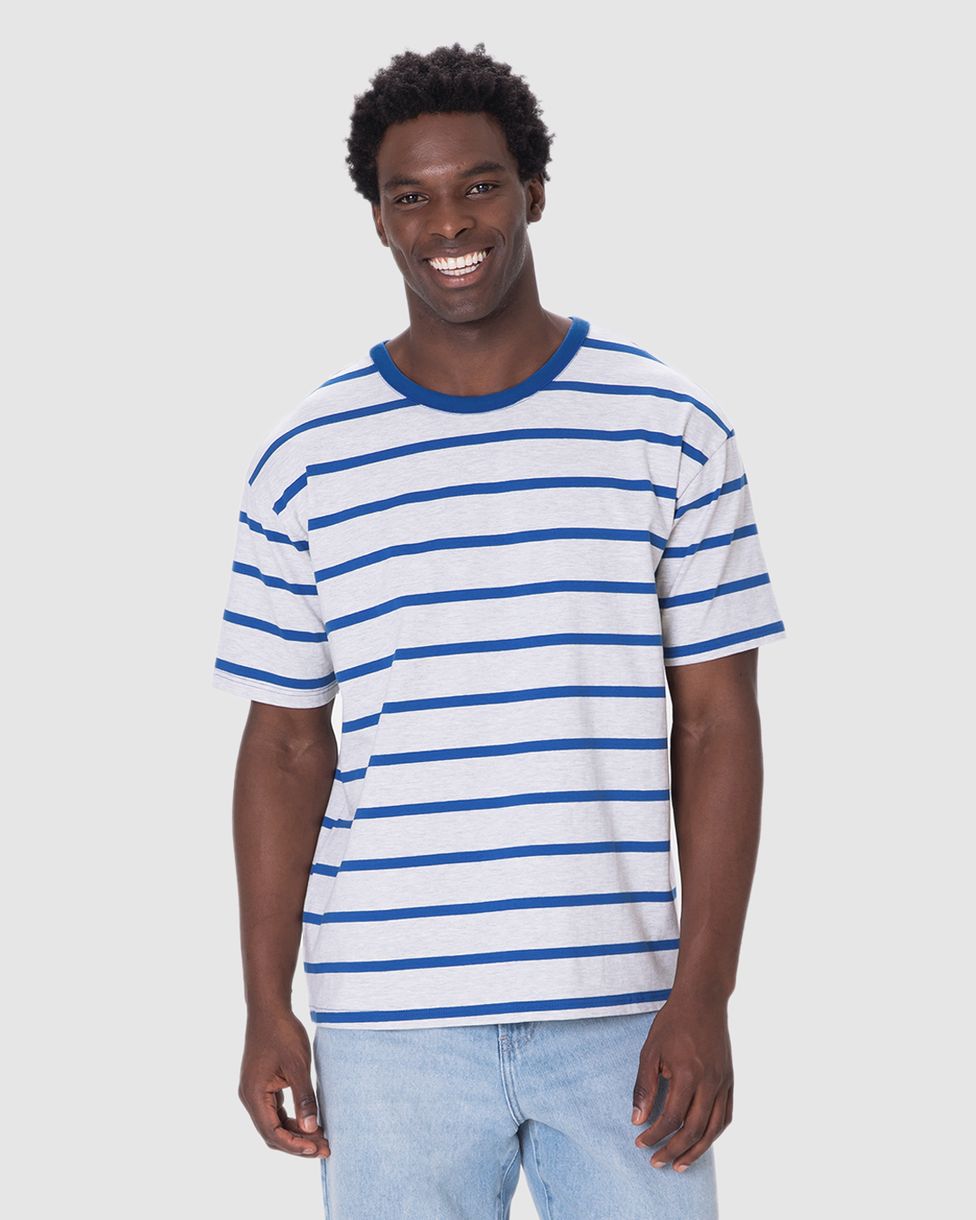 Camiseta Masculina Regular Listrada Manga Curta Em Algodão Cinza - G