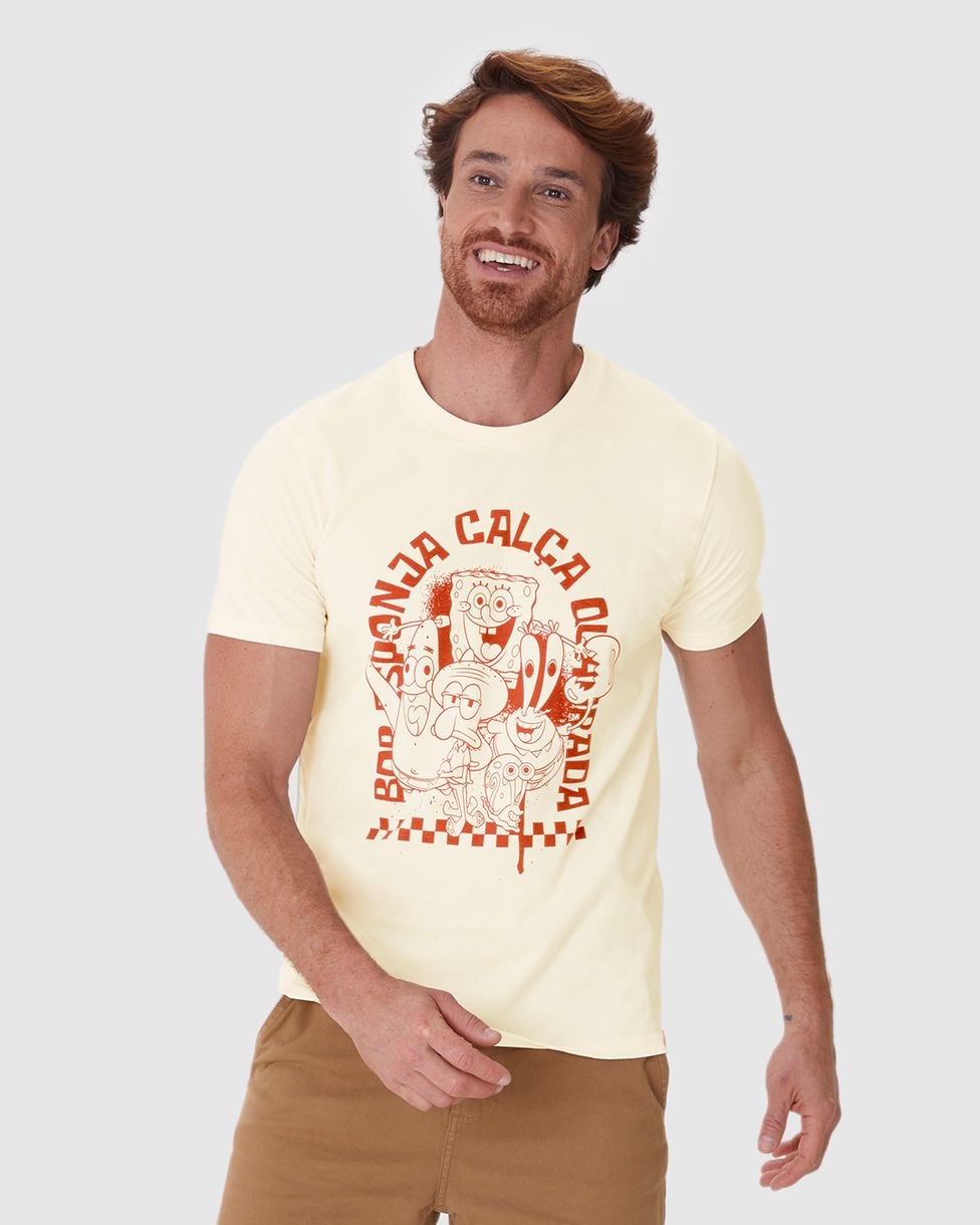 Camiseta Masculina Slim Bob Esponja Calça Quadrada Em Algodão Off White - G