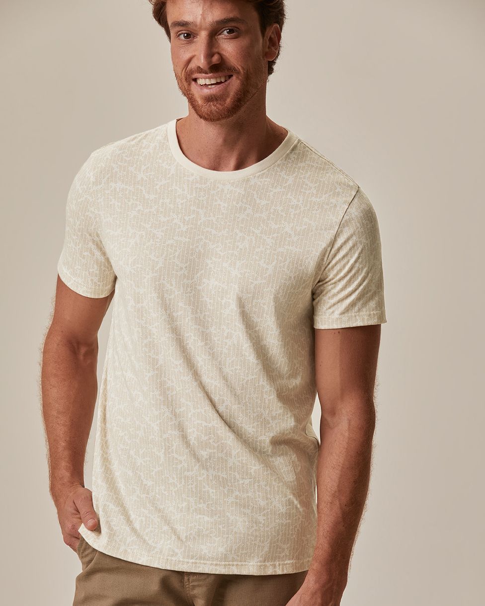 A Camiseta Masculina Slim Manga Curta com Estampa Corrida em algodão combina estilo contemporâneo com conforto diário. Seu caimento ajustado valoriza a silhueta, enquanto a estampa corrida adiciona um toque moderno e exclusivo, perfeita para diversas ocasiões casuais.