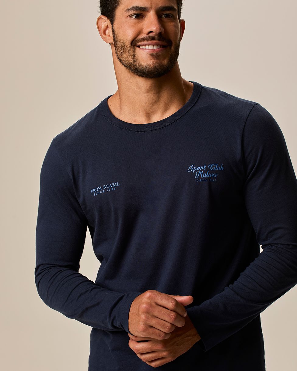 Camiseta Masculina Slim Manga Longa Estampada Em Algodão Azul - XGG