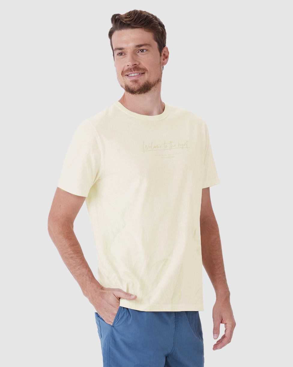 Descubra o conforto e o estilo da Camiseta Masculina Welcome To The Resort Estampada Em Algodão. Inspirada na beleza tropical, traz frases exclusivas e design moderno para compor looks leves e autênticos no seu dia a dia.