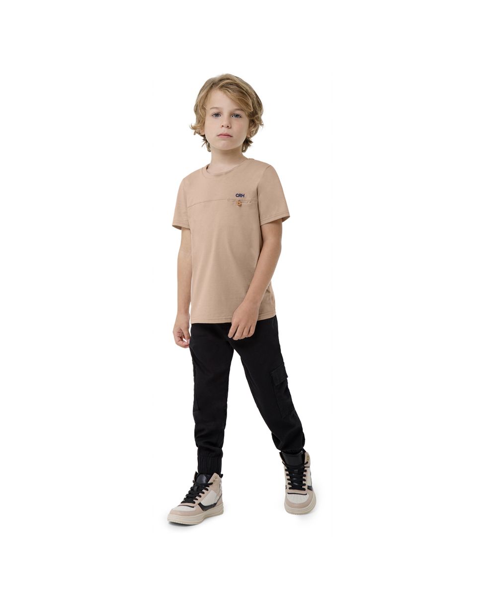 Camiseta confeccionada em meia malha. Um modelo básico para acompanhar as crianças no dia a dia, essa peça possui decote redondo com detalhe de viés interno, mangas curtas, recorte e detalhe em botão no peitoral. Além disso, a meia malha é um tecido que tem bom caimento, durabilidade e proporciona leveza e frescor ao vestir. Combine com bermuda Carinhoso e tênis!