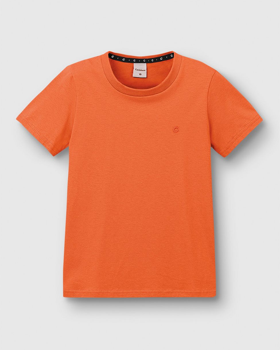 Camiseta confeccionada em algodão meia malha. Um modelo clássico para acompanhar os meninos no dia a dia. Essa peça conta com caimento tradicional, que acompanha as linhas do corpo com muito conforto. Com decote redondo, mangas curtas e detalhe frontal de bordado da marca. O modelo apresenta em seu diferencial um viés interno em tom contraste e personalizado. A meia malha é um tecido que tem bom caimento, durabilidade e proporciona leveza e frescor ao vestir. Para um visual casual, combine com bermuda em jeans, tênis slip on e boné!