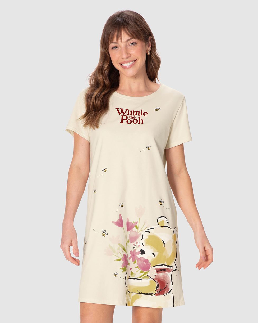 A Camisola Feminina T-Shirt Estampa Ursinho Pooh Disney® é feita em 100% algodão, garantindo conforto e toque suave para suas noites. Com estampa delicada do Ursinho Pooh, une charme e aconchego, perfeita para momentos de descanso com estilo e leveza.