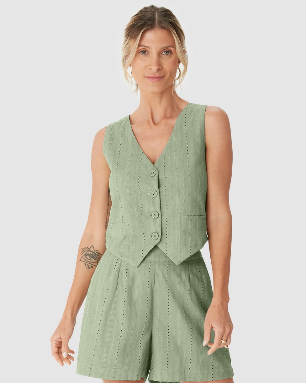 Colete Feminino Cropped Detalhe Bordado Em Laise Algodão Verde - G