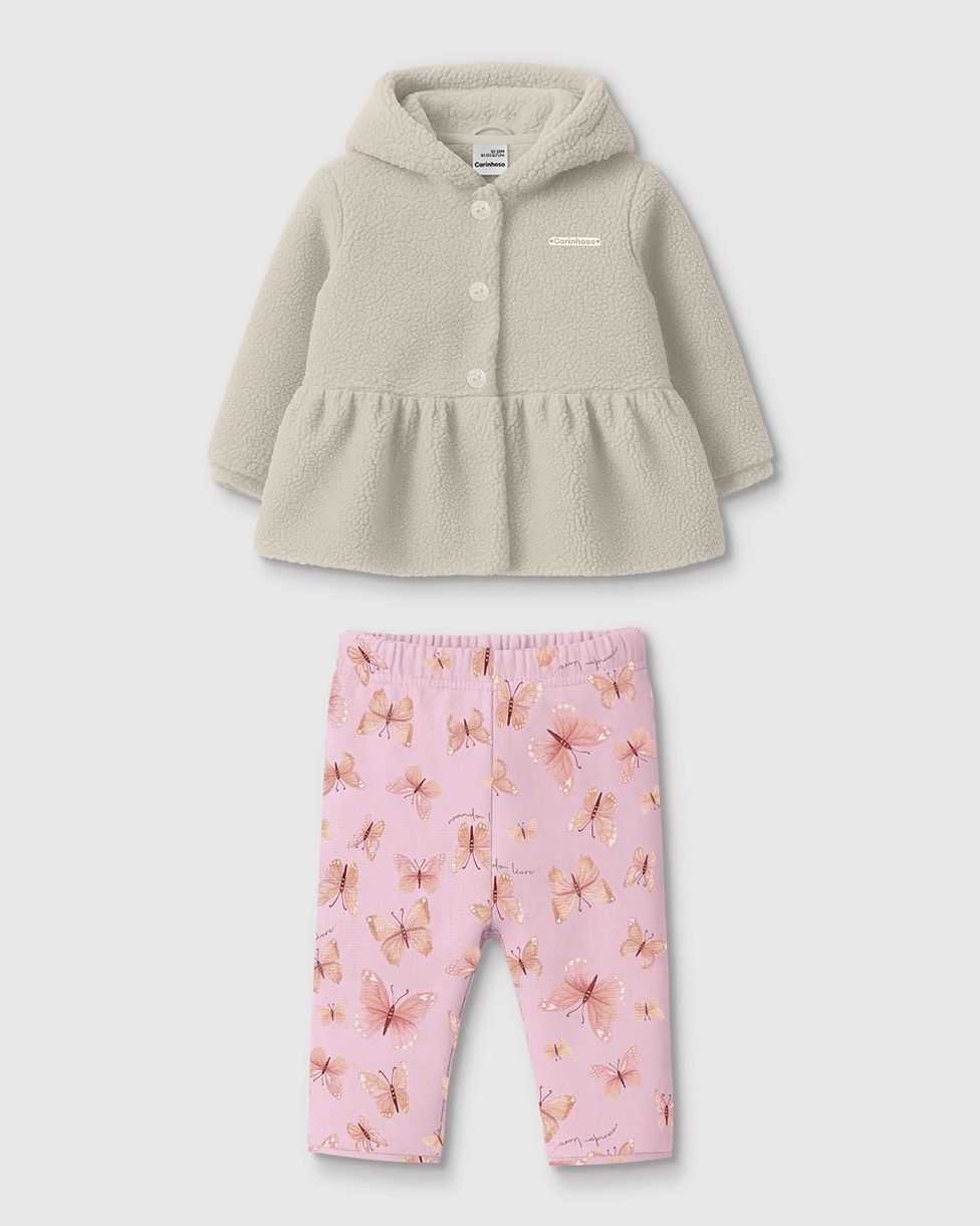 O Conjunto Bebê Menina Casaco Pelúcia Lurex E Calça Estampada da Carinhoso é puro aconchego. O casaco com capuz em pelúcia lurex possui brilho sutil e babados, enquanto a calça em soft traz uma estampa lúdica de borboletas, garantindo um visual quentinho e encantador.