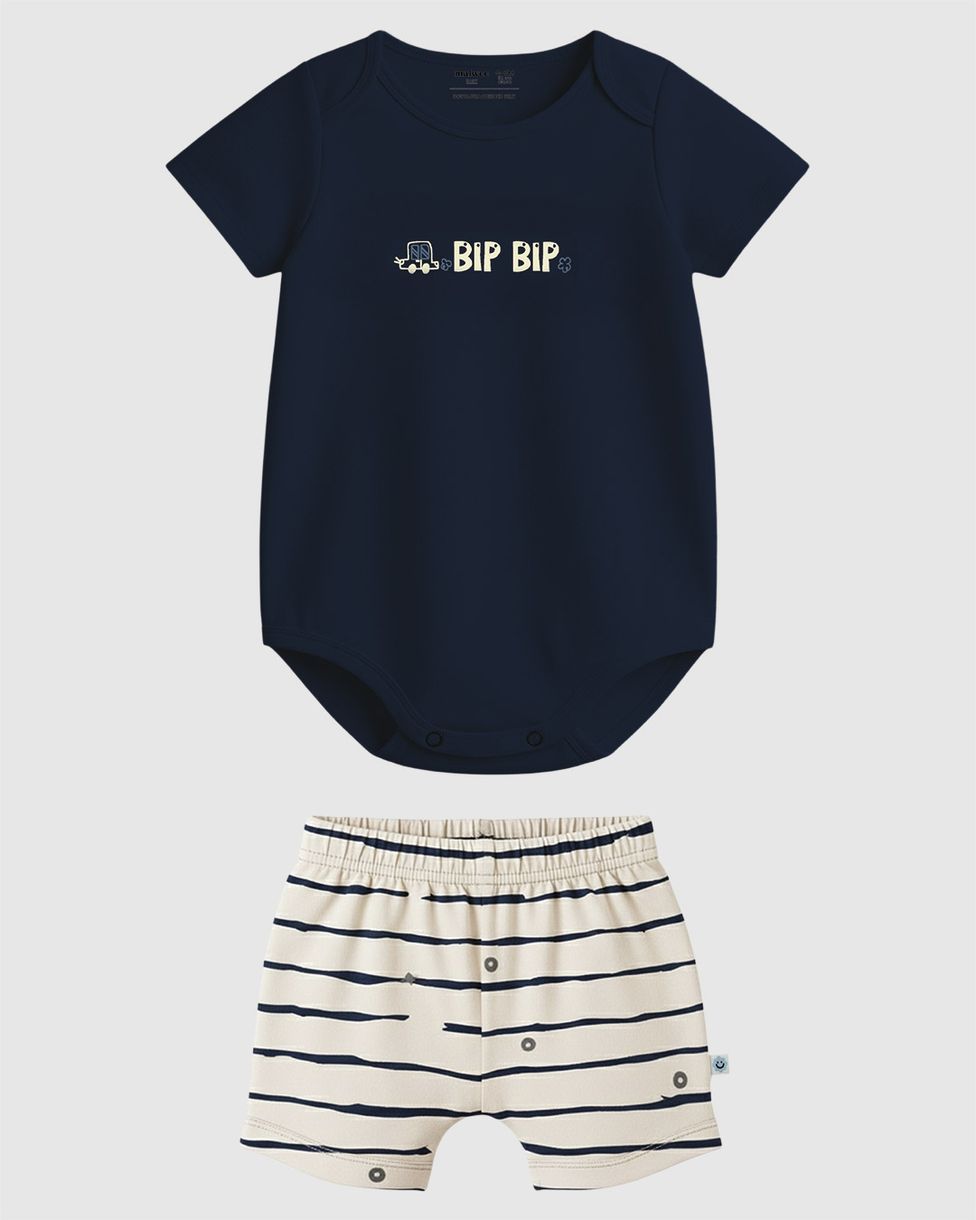 O Body de manga curta é feito em malha algodão, tecido macio e perfeito para a pele sensível do bebê. Possui uma estampa minimalista e divertida ("BIP BIP!"). A bermuda estampada complementa o visual com a moderna modelagem Saruel, que oferece conforto extra e liberdade para o movimento das perninhas. Com botões de pressão para facilitar a troca, este conjunto é essencial para o dia a dia de bebês de 0 a 24 meses.