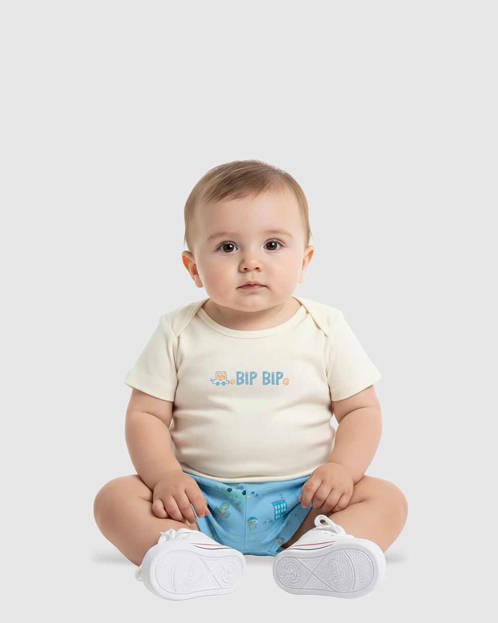 O Body de manga curta é feito em malha algodão, tecido macio e perfeito para a pele sensível do bebê. Possui uma estampa minimalista e divertida ("BIP BIP!"). A bermuda estampada complementa o visual com a moderna modelagem Saruel, que oferece conforto extra e liberdade para o movimento das perninhas. Com botões de pressão para facilitar a troca, este conjunto é essencial para o dia a dia de bebês de 0 a 24 meses.