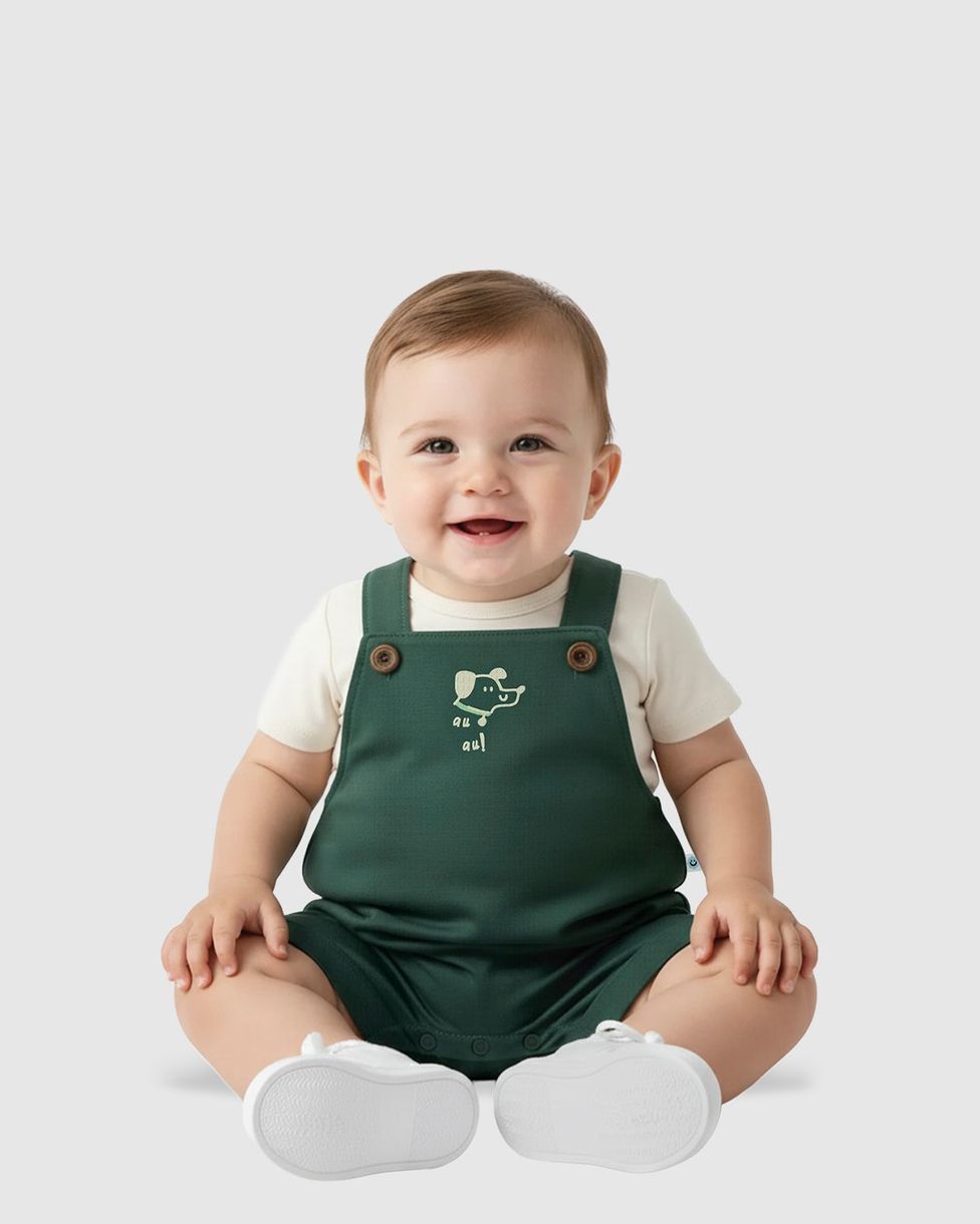 Este conjunto prático inclui body em malha algodão, super macio e um charmoso macacão em malha texturizada. O macacão tem uma linda estampa de cachorrinho com a técnica puff, que adiciona um divertido relevo. As alças contam com regulagem de tamanho por botões. Perfeito para bebês de 0 a 24 meses, unindo conforto e estilo.