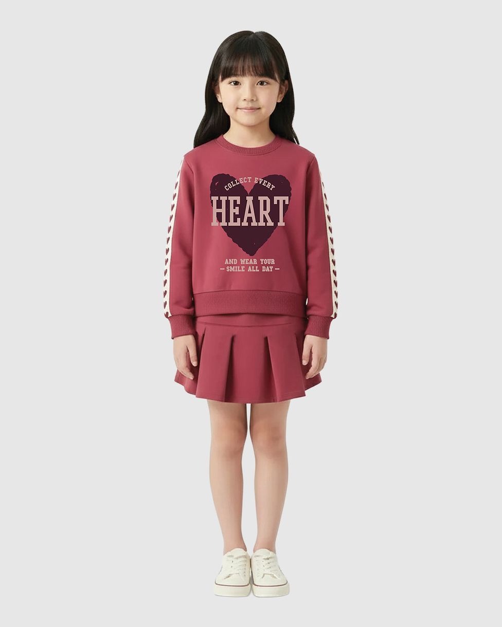 O Conjunto Infantil Menina Blusa Heart e Saia Pregas da Malwee Kids une a doçura do design romântico com a versatilidade do moletinho. Perfeito para o Outono Inverno, ele destaca uma linda estampa com glitter e detalhes de corações nas mangas da blusa, garantindo um visual encantador e confortável.