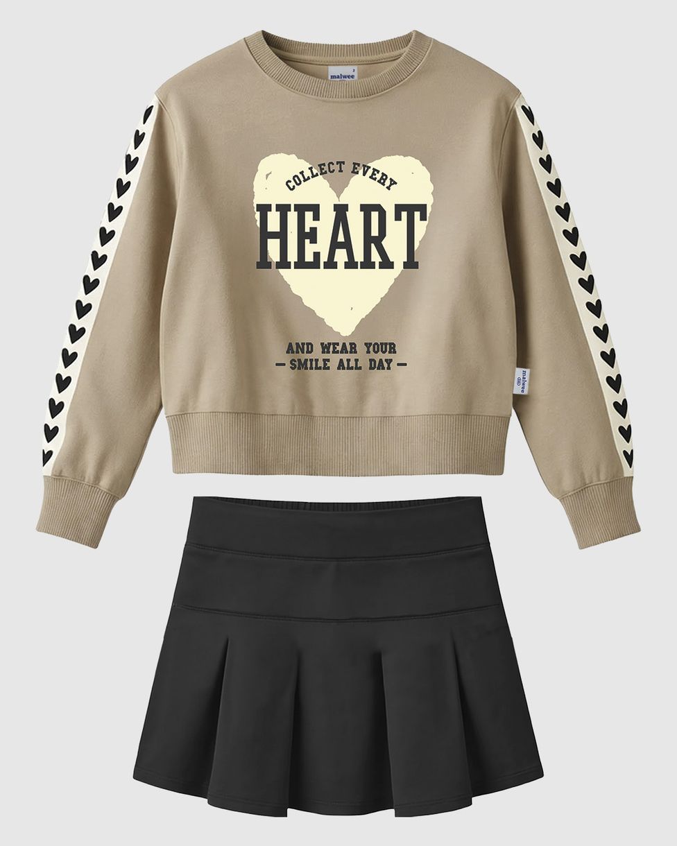 O Conjunto Infantil Menina Blusa Heart e Saia Pregas da Malwee Kids une a doçura do design romântico com a versatilidade do moletinho. Perfeito para o Outono Inverno, ele destaca uma linda estampa com glitter e detalhes de corações nas mangas da blusa, garantindo um visual encantador e confortável.