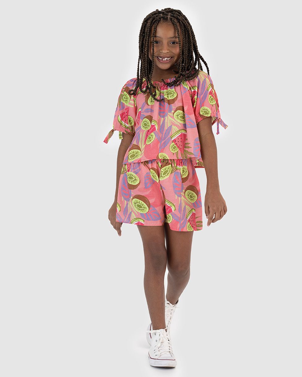 O Conjunto Infantil Menina Blusa Manga Com Abertura em tecido viscose leve é perfeito para o verão. Com estampa tropical vibrante, a blusa de mangas com abertura e amarração oferece frescor e estilo, combinando com shorts confortáveis para momentos de lazer com liberdade e charme.