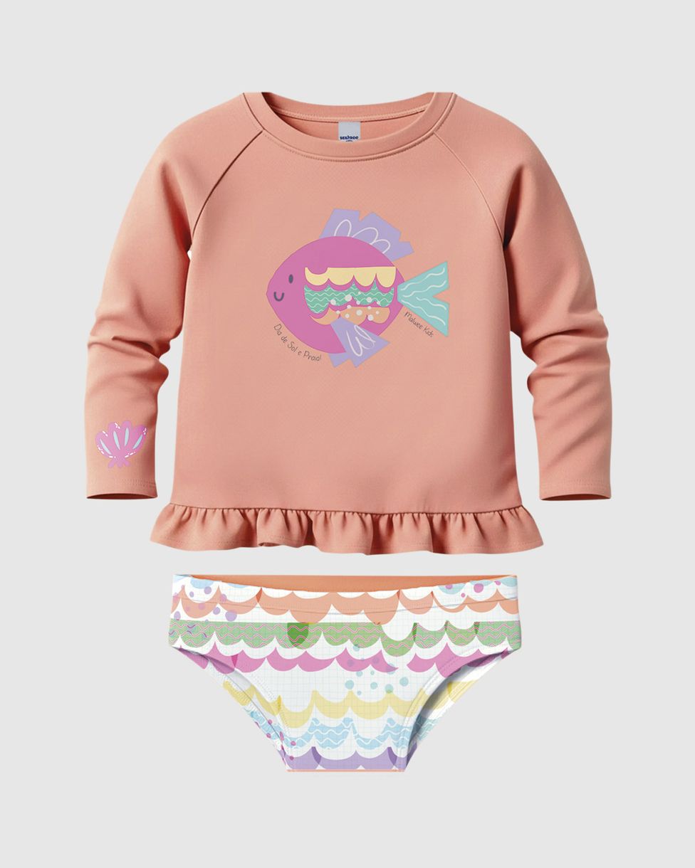 O Conjunto Infantil Menina Blusa Praia Babado Peplum Malha UV50+ Malwee Kids oferece proteção UV50+ e um visual encantador. A blusa de manga longa tem uma divertida estampa de peixe e babado peplum, combinando perfeitamente com a calcinha de estampa colorida de escamas. Ideal para brincar na praia ou piscina com conforto e segurança.